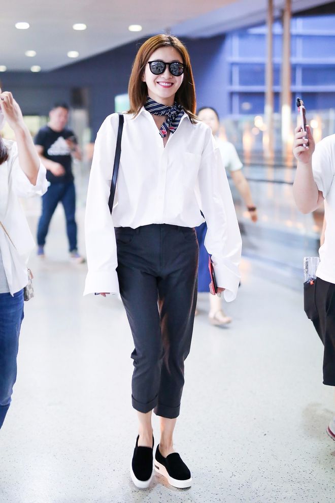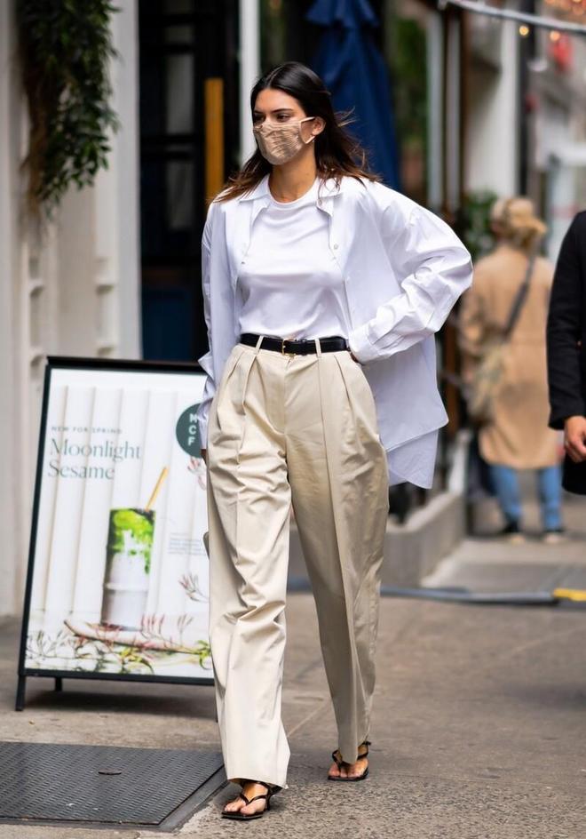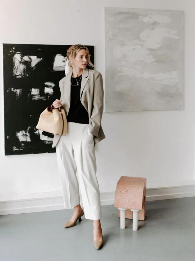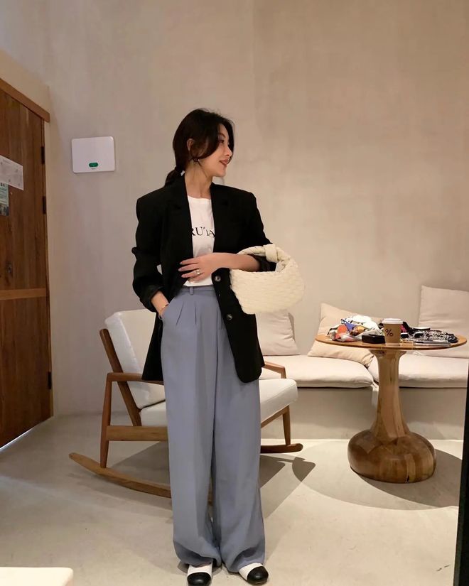 第四种穿搭方式是将西装裤与白色衬衫进行穿搭,白衬衫是职场中的经典单品,搭配西装裤可以展现出干练和专业感。可以选择将白衬衫塞入西装裤内,或者打个结束腰,增加一丝时尚感。下面穿一双尖头高跟鞋,使整体造型更加利落。同时选择一款简约的手提包,整体造型更显得干练与专业。
