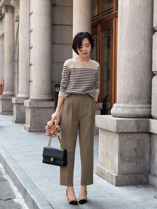 第五种穿搭方式是将西装裤与针织衫进行搭配,针织衫既可以展现出女性的柔美与温暖,又能为整体造型增加一丝随性感。选择一款颜色鲜艳的针织衫,可以让你在职场中成为亮点。搭配一双中跟鞋,既可以展现你的职业形象,又能增加一丝女性的温柔与优雅。同时选择一款适合上班的背包非常重要,让整体造型更加实用和时尚。