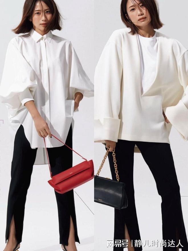 这两套造型所采用的微辣西装裤在裤子脚处都形成了一个倒v字,有一种视觉的延伸效果,让腿型更加纤细。