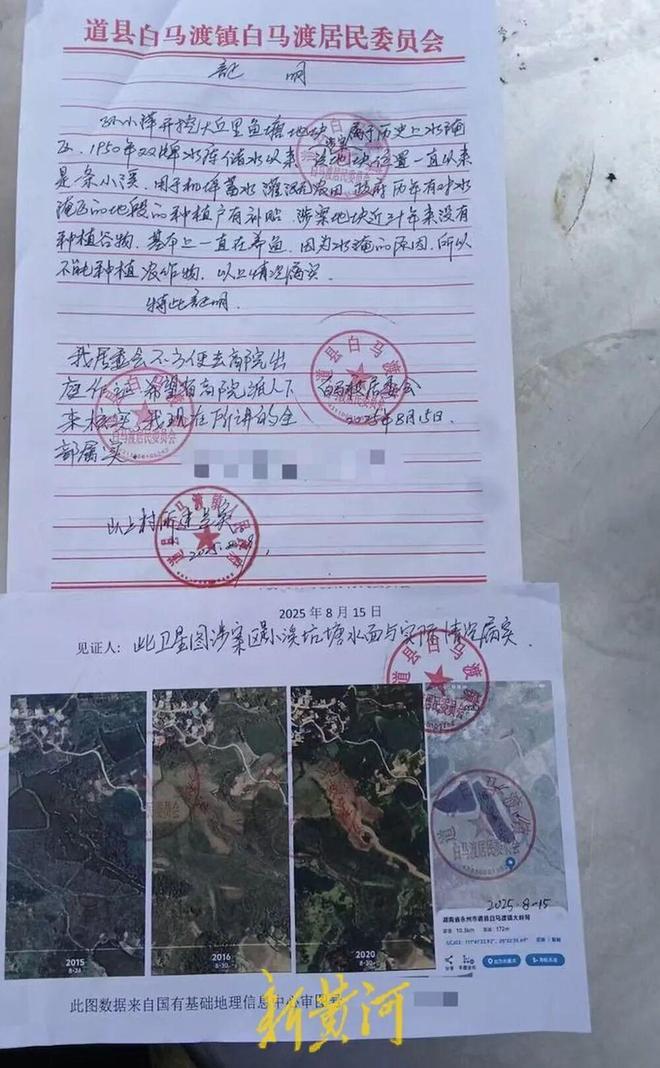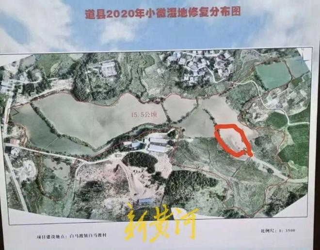 吴耀都给新黄河记者展示了涉案地块周边的一个展示牌,展示牌上显示,包含涉案地点在内的整个坑塘水域230余亩已被划为白马渡小微湿地项目,该项目主管单位为道县人民政府。据红星新闻报道,一份由白马渡村村委会撰写、白马渡镇镇政府呈报、道县政府某领导签字支持的请示显示,该村因受水淹影响,内水水面宽,是打造乡村农业、休闲观光的绝佳基地,拟规划建设白马渡镇渔业养殖休闲观光基地示范项目,打造全县最大规模的休闲观光重要示范基地。根据该文件,该项目基地建设内容为对现有水面拓宽、加深、围堤砌护坡,建设休闲观光步行道等。
